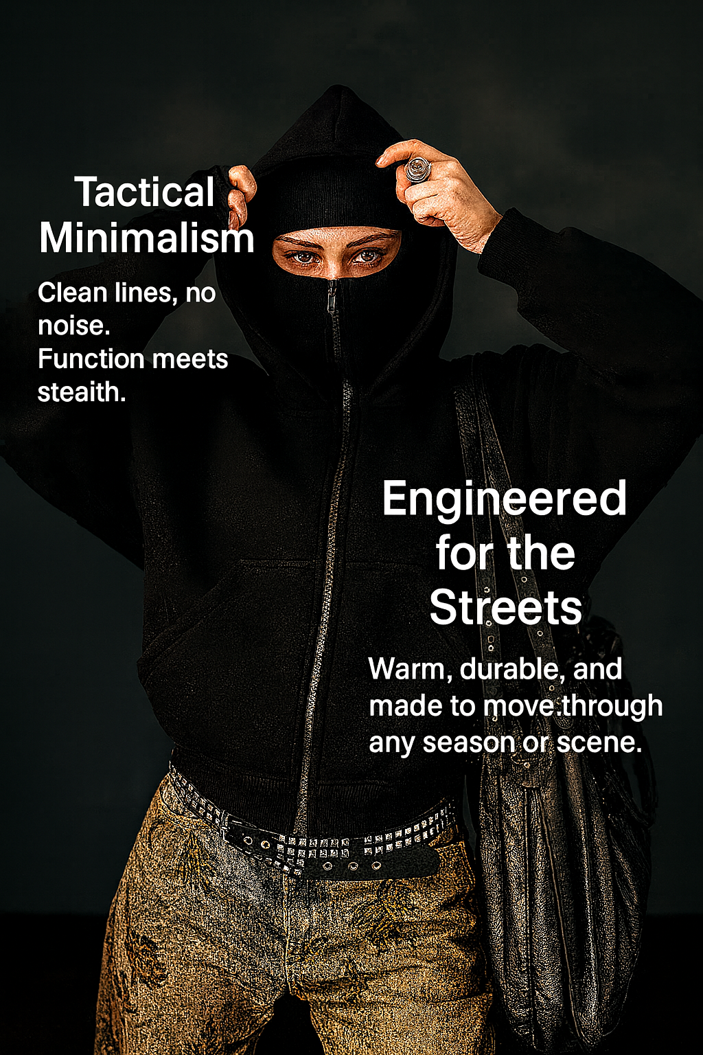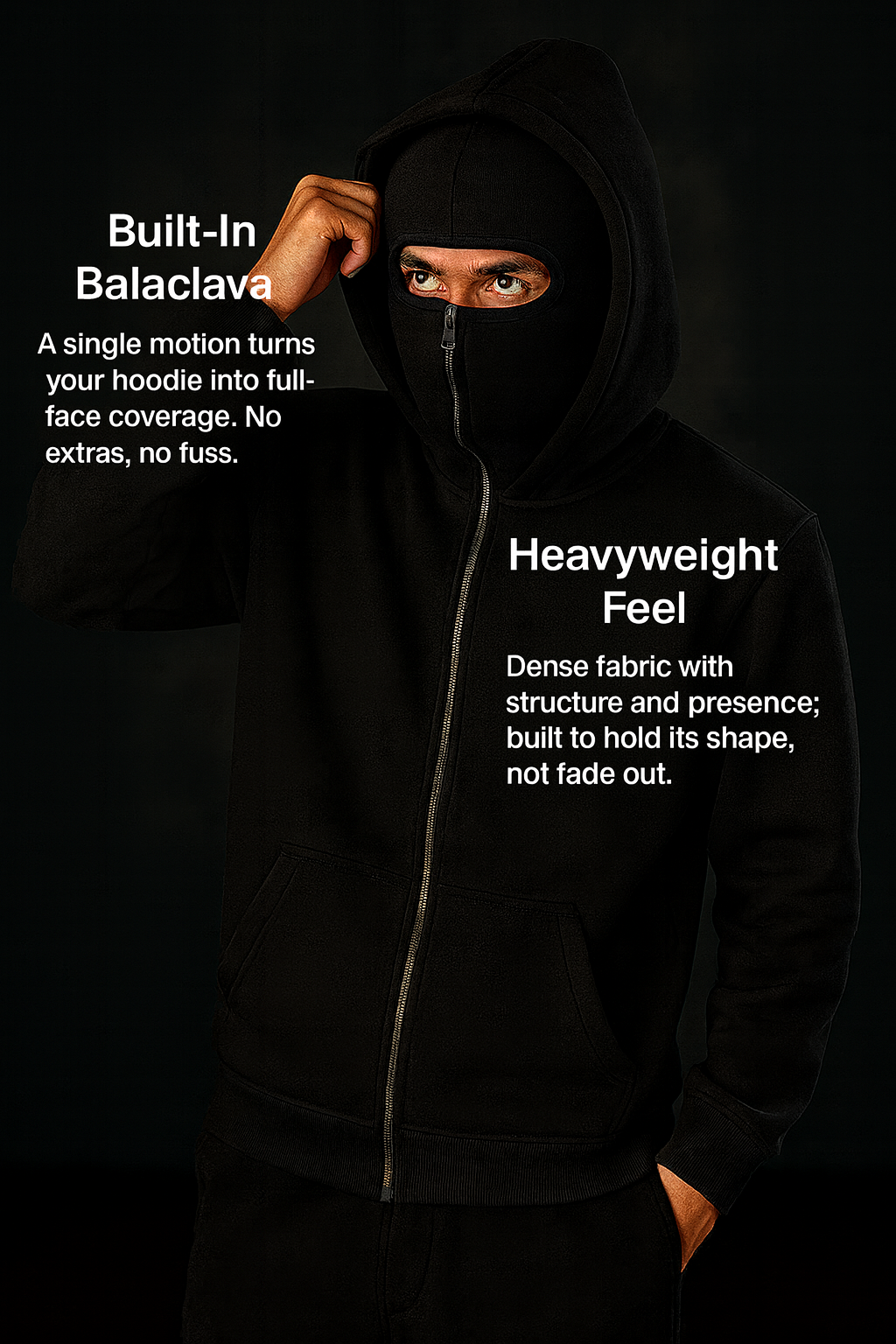 - Built-In Balaclava – A single motion turns your hoodie into full-face coverage. No extras, no fuss.